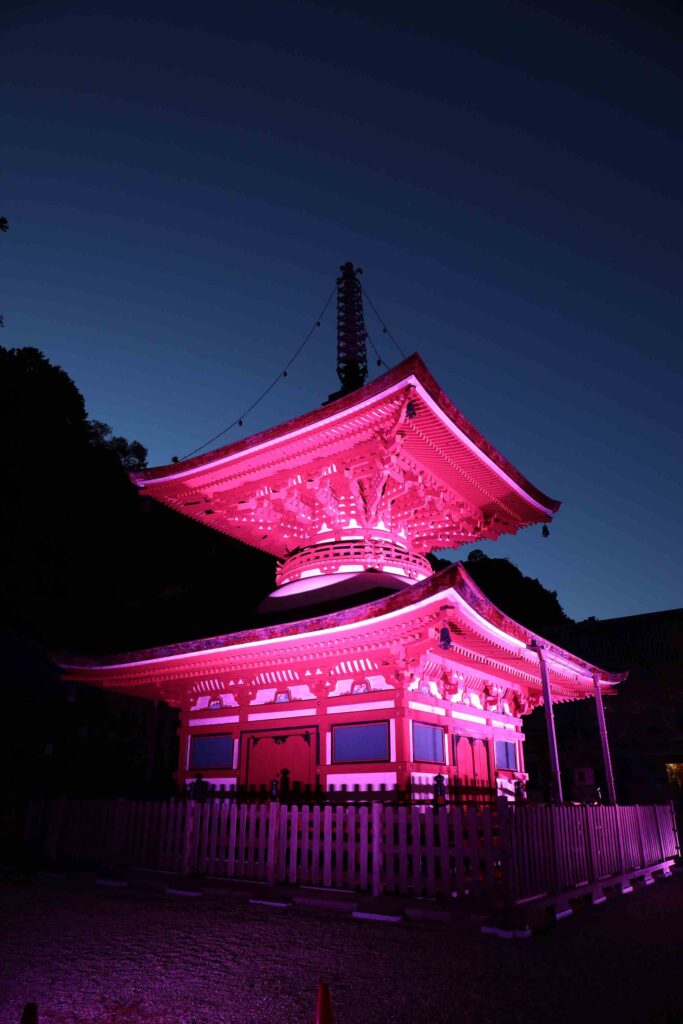 お知らせ 2025年10月02日 多宝塔ライトアップ 実施中 18時~20時(入山19時30分まで) 拝観料無料 Pink Ribbon Day 10月3日まで 多宝塔をピンク色にライトアップ実施中 ピンクリボン運動に協賛して乳がん撲滅を祈念して実施しています。 ・期間 10月3日まで ・拝観料無料 (18時からの入山のみ)