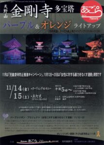 お知らせ 2025年11月06日NEW 多宝塔パープル&オレンジ ライトアップ 11月14日(金)~15日(土)午後5時より *「児童虐待防止推進キャンペーン」・「女性に対する暴力をなくす運動」に協賛ライトアップ *「暴力、虐待の根絶と人々の幸福を祈願する法要」 ・日 時 11月14日(金)・オープニングセレモニー 午後5時~午後7時30分 11月15日(土)・点灯式 午後5時~午後7時 両日とも午後6時から法要 ・拝観料 無料